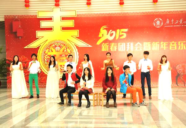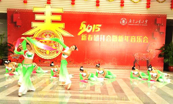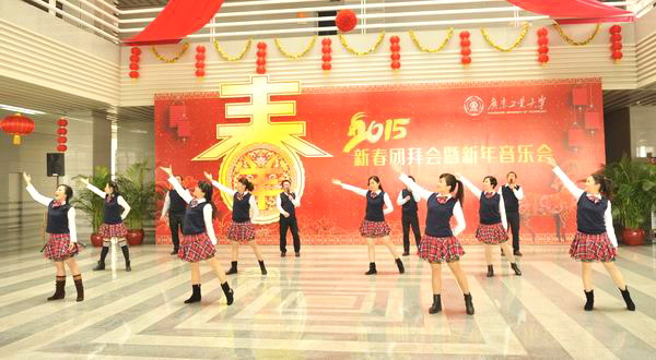 全体校领导以小组唱《革命人永远是年轻》拉开团拜会序幕,祝福广工人永远年轻,学校各项事业朝气蓬勃、欣欣向荣。交响管乐团、教务处、工会、离退休处、学生合唱团、学生舞蹈团、党群工会等奉上了一场丰富多彩的文艺演出,演奏、独唱、歌曲串烧、群舞、小组唱、男子群舞、歌舞等,个个节目精彩纷呈。节目中还穿插了游戏《击鼓接福》。现场呈现喜乐祥和的热闹气氛。