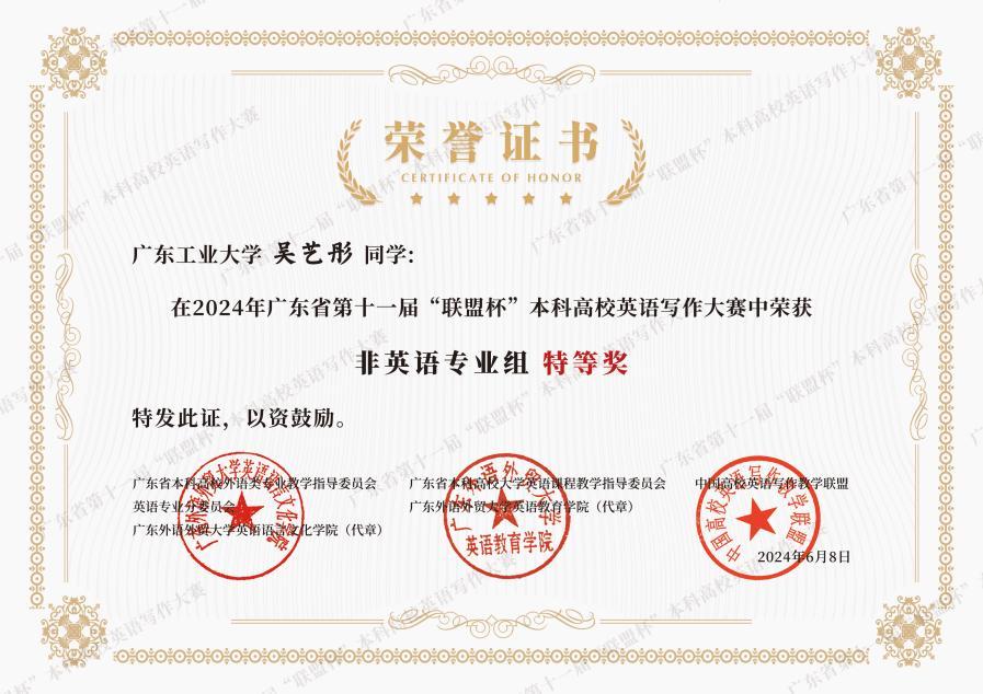 6月8日,广东省第十一届“联盟杯”本科高校英语写作大赛决赛暨颁奖典礼在广州工商学院成功举行。国际教育学院工商管理专业2023级(国际班)吴艺彤同学凭借扎实的英语基础,在本次决赛中发挥出色,获得大学英语组特等奖。