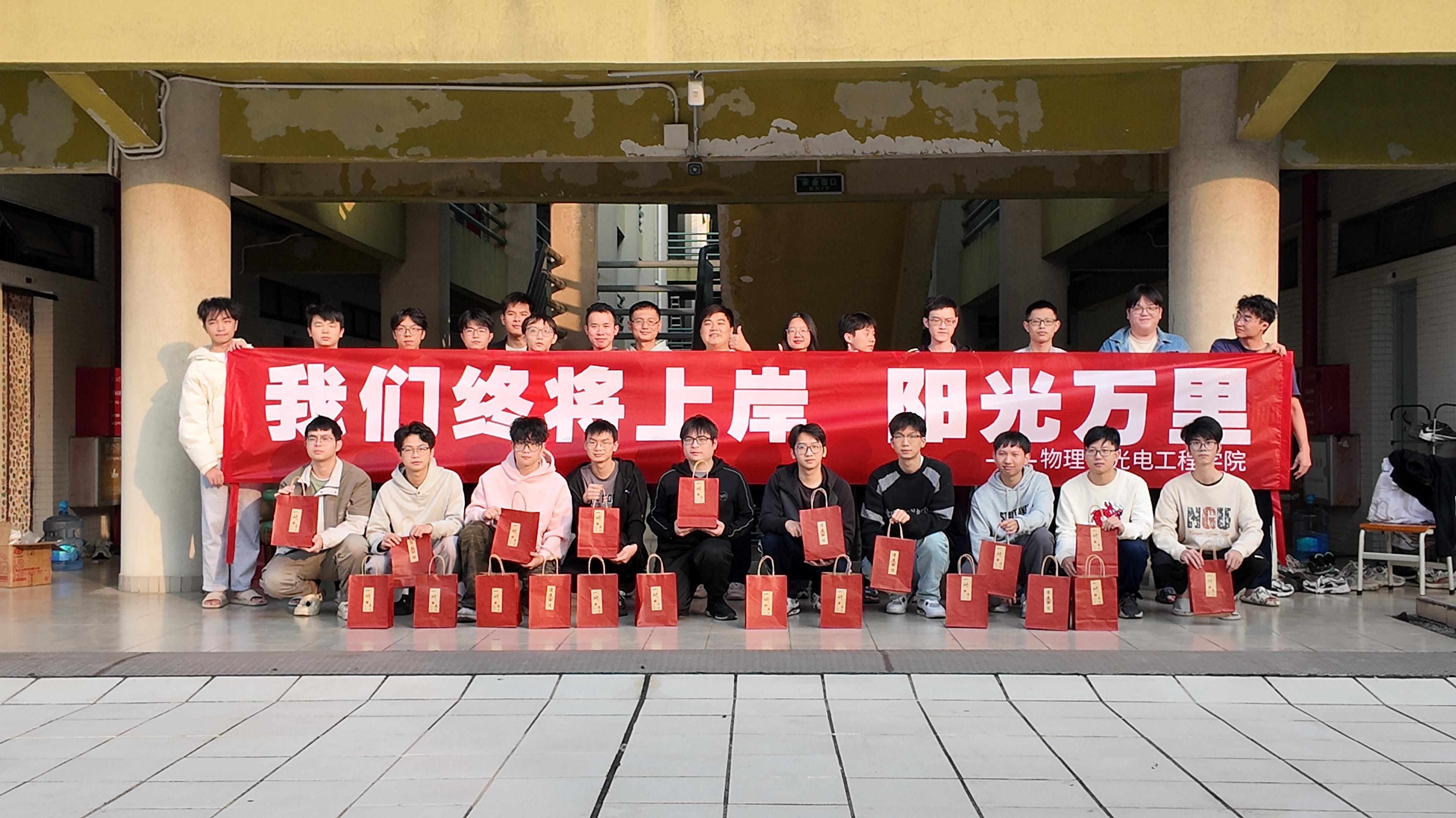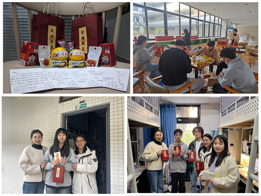 物理与光电工程学院组织了“情暖冬日,研途相伴”考研送温暖活动,学院2021级辅导员,班主任代表走访学生宿舍,与备考学生倾情交流,关心关注学生的心理状态,为学子们送上温暖与关怀。物理与光电工程学院为考研学子准备了200份考研“暖心加油包”。包内装有实用的文具用品、印有祝福语的书签、寓意“一战成硕”的橙子,以此传递学院对考研学子的真挚祝福与美好祝愿。