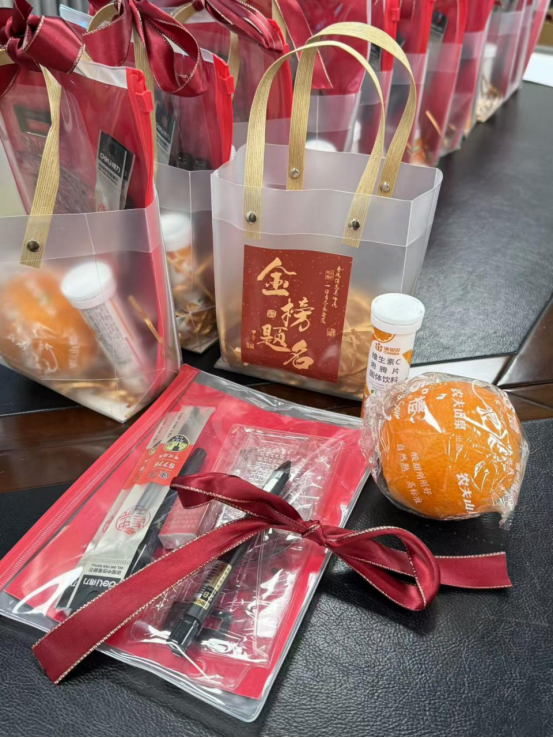 机电工程学院负责人、班导师代表、2021级本科生辅导员深入西区宿舍,亲自将350余份精心准备的“暖心大礼包”送到学生手中,并赠与暖心祝愿,希望同学们用最好的状态迎接考试。“暖心大礼包”内涵丰富、寓意深远。祝福卡片承载着学院对考研学子最真挚的期许与祝福,考研专用文具套装、橙子心意满满,祝愿考研学子妙“笔”生花、心想事“橙”、一战成硕。此间,老师们也深入学生宿舍,与同学们亲切交谈、加油鼓劲。关切询问同学们的备考情况及身体状态,嘱咐同学们以平和的心态、强健的身体迎接考试的到来。