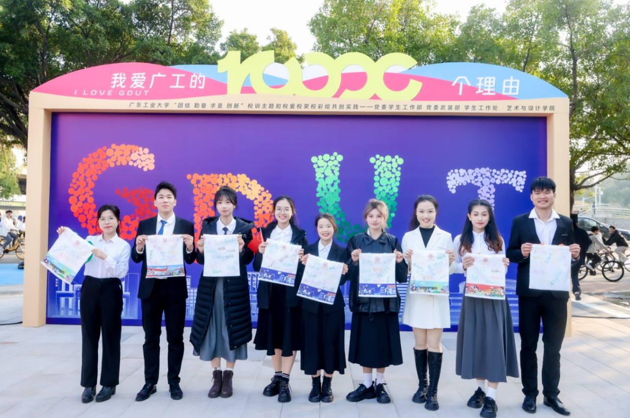 活动上,首次发布由2023级设计学硕士研究生金煜利用AI创作的活动主题曲《我爱广工的10000个理由》,由艺术与设计学院声歌队现场演绎。歌曲轻快悦耳,引起全场共鸣,备受好评。现场还设有五个特色环节:知校·情深叙怀:“我和广工的故事”视频共创;绘校·聚力添彩:“我为GDUT添新彩”彩绘共创;爱校·心心相印:“I ❤ GDUT”文创共创;荣校·光影芳华:“我与广工合个影”照片共创;兴校·攀撑永续:校训主题系列文创产品兑换。热情的广工师生纷纷以校训为引,畅谈“我与广工的故事”,讲述“我爱广工的理由”。活动主背景由现场观众、路过学生和志愿者共创完成,现场还有文创共创环保袋、明信片、卡包、钥匙链等校训主题创意文创派发,各摊位前人潮涌动,同学们纷纷用双手创作出独属于广工记忆的青春文创。