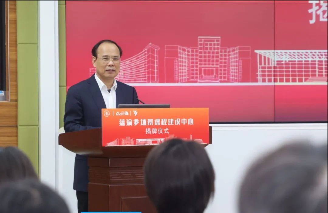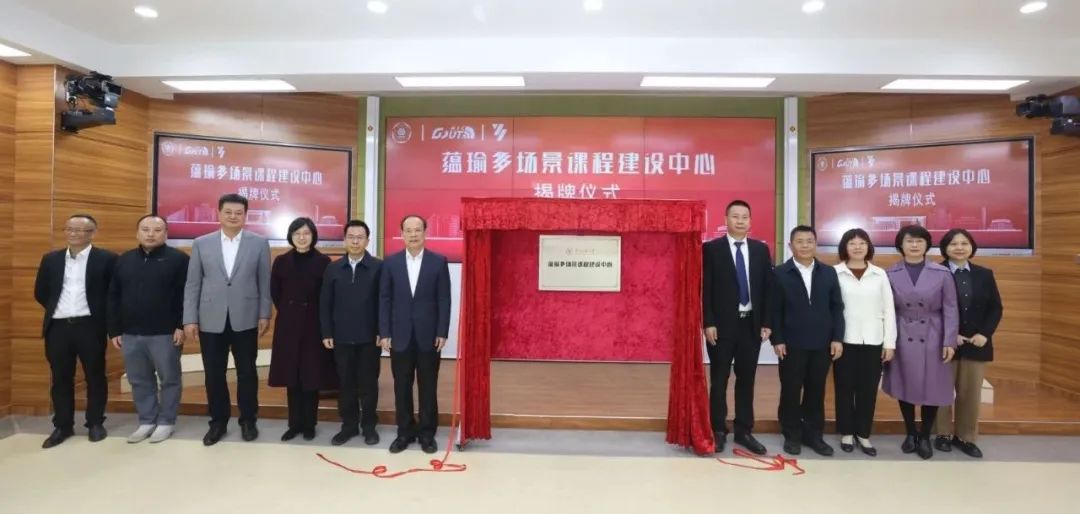 当天,学校还举行了蕴瑜多场景课程建设中心揭牌仪式。作为学校2024年十件民生实事之一,蕴瑜多场景课程建设中心(以下简称“蕴瑜建课中心”)的建成,为人工智能赋能课程教学提供有效支撑,既可以满足老师们多场景录课、多校区直播等教学需求,也可以提升跨校区办校的教学质量。