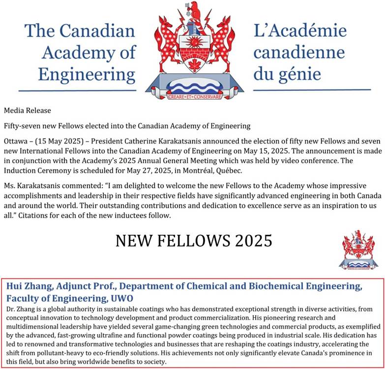 加拿大国家工程院官网对张辉院士的介绍显示:“张辉博士是环保涂层领域的国际权威,在从概念创新到技术开发和产品商业化等多元化活动中展现出非凡实力。他以开创性的研究和多维度的领导力培育了多项颠覆性绿色技术及商业化产品,…..他致力于打造具有行业变革性的技术和商业模式,推动涂料产业从高污染向环境友好型解决方案转型。他的成就不仅显著提升了加拿大在该领域的国际地位,更为全球社会带来了福祉。”