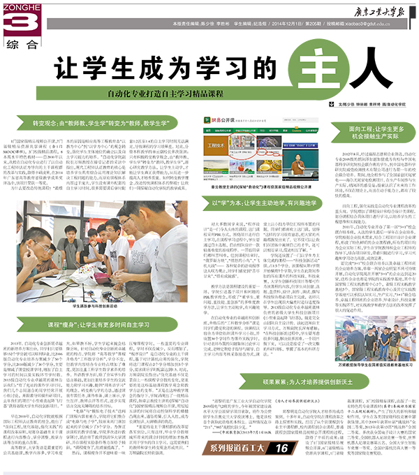 为什么要改造传统课程?“最根本的原因是顺应高等工程教育由‘以教为中心’到‘以学为中心’的观念转变,强化学生主体地位的确立以及自主学习能力的培养。”自动化学院副院长万频教授在接受记者的采访中指出,现代工程师认证教育的核心是培养学生具有综合运用理论知识解决工程问题的能力,而原有课程体系内容过于庞大,学生没有课外配套的自主学习时间,很多需要课后学时配套1:2甚至1:4的自主学习时间无法满足,导致课程的学习效果差。对此,分管本科教学的章云副校长多次强调:只有积极转变教学理念,由“教师教、学生学”转变为“教师,教学生学”,潜心研究教学方法,让学生主动学,才能让学生真正获得能力,从而进一步提高人才培养质量。如何转变教学理念、改进传统课程体系的弊端?让我们一同探秘自动化学院的教学成果。