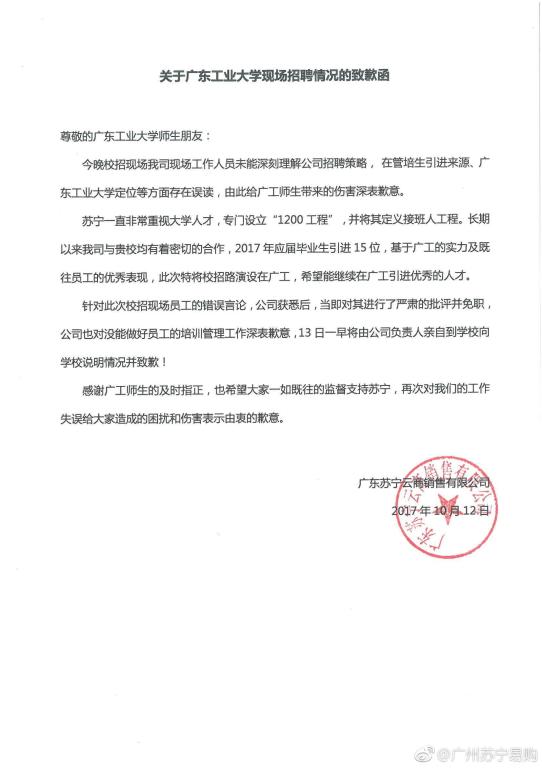 10月12日晚,广东苏宁云商销售有限公司来开元网页版_开元(中国)龙洞校区举办招聘宣讲会。苏宁公司工作人员在宣讲会上对我校办学情况存在误读,并出现招聘条件不公平的言论,引起学生的不满,并在网上传播。学校相关部门立即与苏宁公司进行了沟通和交涉,得到对方快速回应。苏宁公司当晚在网上公开致歉,10月13日上午委派两名代表亲自上门致歉,并递交致全校师生的《关于开元网页版_开元(中国)现场招聘情况的致歉函》。我校接受广东苏宁公司的真诚道歉。