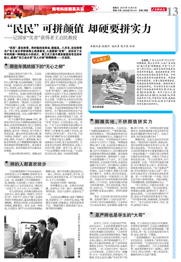 脚踏实地,也是王启民对学生的要求。“现在的孩子选择多、诱惑也多,他们会想现在做的东西有什么用,希望立刻出成效。”针对发表论文一事,王启民常常教导学生要重质量而不是一味追求数量:“一定要让别人觉得我们做的东西有价值,不能为了发表文章而发表文章。”在王启民看来,学习态度是第一位的。“有的同学基础不够好,但只要他肯全心投入,多花时间,即使进步慢也没关系。”由于他要求严格,学生们称他为“完美主义者”。研三的学生聂志伟为了改善涂层表面的质量,曾一个学期只做一个实验,“因为总达不到王老师的要求。只能反复做,不停调整参数,直到质量够好为止。”