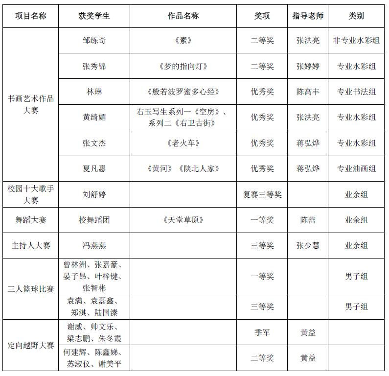 第十二届广东大中专学生校园文体艺术节各竞赛项目我校获奖名单一览表