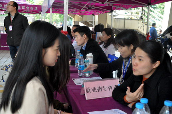学校就业指导中心老师现场指导前来咨询求职的毕业生