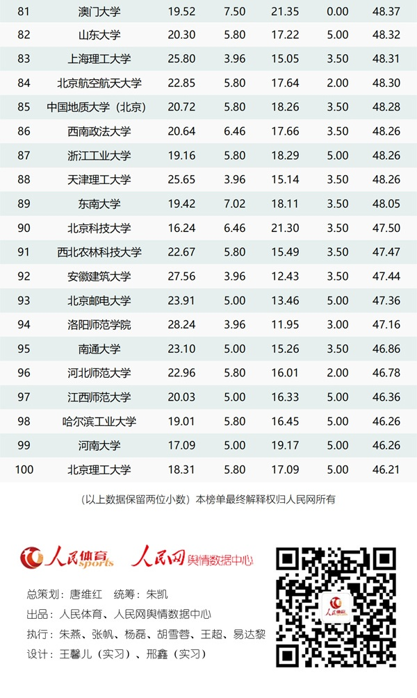 综合各项指标,北京体育大学蝉联榜首,北京大学和上海体育学院紧随其后,四至十名其他高校依次为:清华大学、哈尔滨体育学院、西南大学、浙江大学、中南大学、武汉体育学院、上海大学。我校在该榜排第32 位,列广东高校第三位,首度进入该榜单50强。广东共有9所高校进入top 100榜单,依次分别是中山大学(17位) 、深圳大学(26位)、开元网页版_开元(中国)(32位)、广州体育学院(40位)、华南师范大学(46位)、广东外语外贸大学(52位)、华南理工大学(59位)、暨南大学(68位)、广州大学(78位)。