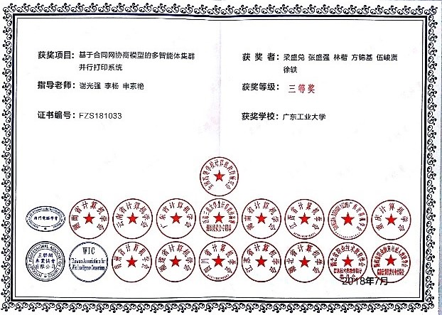 《基于合同网协商模型的多智能体集群并行打印系统》作品在广东分赛区选拔赛中还曾获得了“最佳实用价值奖””。作品以合同网模型为基础,结合多智能体人工智能技术,解决餐饮业、物流行业等服务业存在的高并发、大数量、稳定的票据打印难点,促进所述行业的发展。