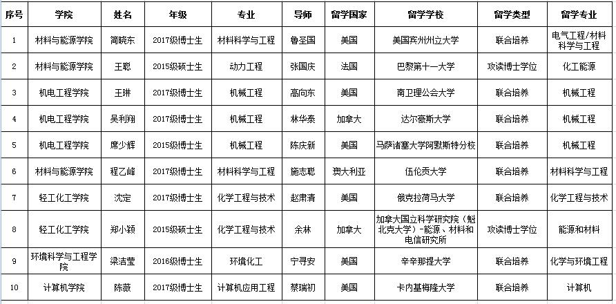 本网讯  近日,国家留学基金管理委员会公布了“2018年国家建设高水平大学公派研究生留学项目”录取人员名单,我校共有10名研究生榜上有名(5名研究生为我校“研究生拔尖创新人才培育计划”培育对象 ),其中2名同学被录取为攻读博士学位研究生,8名同学被录取为联合培养博士研究生(录取人员名单附后)。我校今年获得留学基金委资助人数较去年增加4人,再次实现了新的突破。