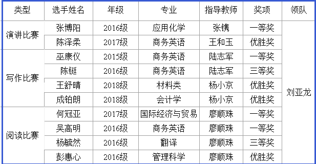 我校共派出10名选手参赛。在演讲大赛复赛中,轻工化工学院2016级张博阳和外国语学院2017级陈泽柔分别获得一等奖和优胜奖。在写作大赛复赛中,外国语学院2015级巫康仪和外国语学院2016级陈铤分别获得一等奖和三等奖、管理学院2018级成铂朗和材能学院2018级王舒晴均获得优胜奖。在阅读大赛复赛中,外国语学院2016级吴高明和经贸学院2017级何冠亚均获得一等奖、外国语学院2016级杨毓然和管理学院2016级彭惠心分别获得三等奖和优胜奖。