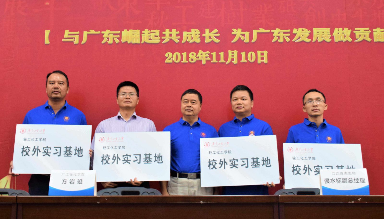 方岩雄还代表学院与东莞市同舟化工有限公司总经理黎庆恺校友共同签订“同舟化工奖学金”协议书,捐赠50万元,用于鼓励我院学子勤于向学,报效祖国,回馈社会。方岩雄院长还代表我院和江门市皇宙实业有限公司、广州顺力聚氨酯科技有限公司、江西真美生物科技有限公司、上海凯茵化工有限公司签署了“轻化学院校外实践基地”。