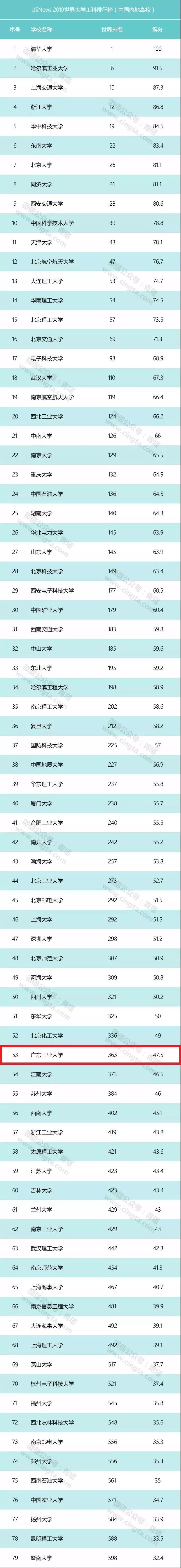 进入USNews 2019世界大学工科排行榜的中国内地高校详细名单如下(排名中并未区分中国地质大学、中国矿业大学和中国石油大学两地办学情况)