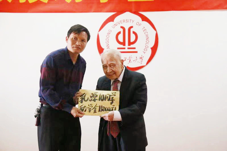 本网讯 10月30日下午,“黎鑫教授助学基金”颁发仪式在学校东风路校区举行。96岁老寿星黎鑫教授持续十二载用自己省吃俭用累积的退休金捐资助学,感动校园。校党委常委、副校长、教育发展基金会理事长陈为民,校关工委主任、原学校党委书记陈年强,乳源民族实验学校副校长赵天金出席助学仪式并对黎鑫教授的大爱善行给予高度评价。
