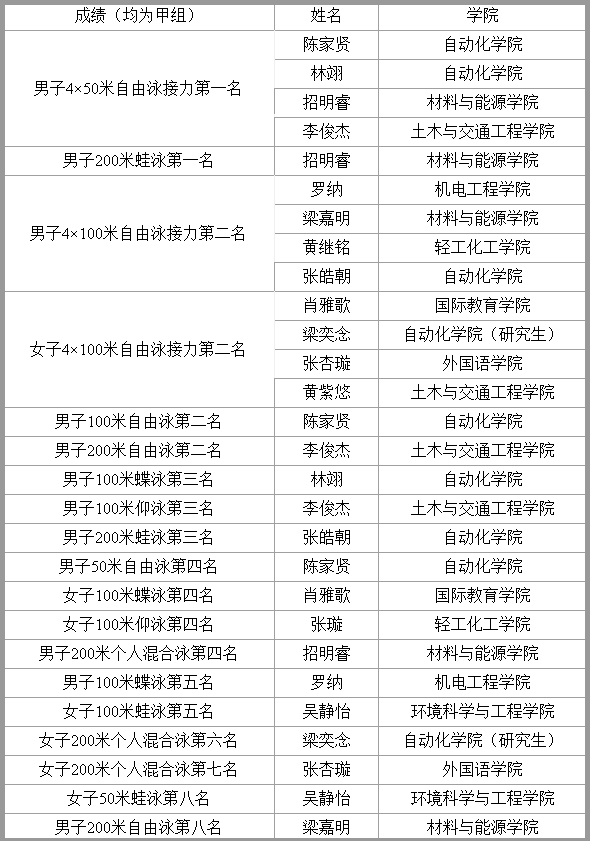 本网讯 2018年广东省大学生游泳锦标赛于10月21日在广州大学城华南师范大学游泳馆落下帷幕。经过2天紧张激烈的争夺,我校斩获2金4银3铜,获得甲组团体总分第一。