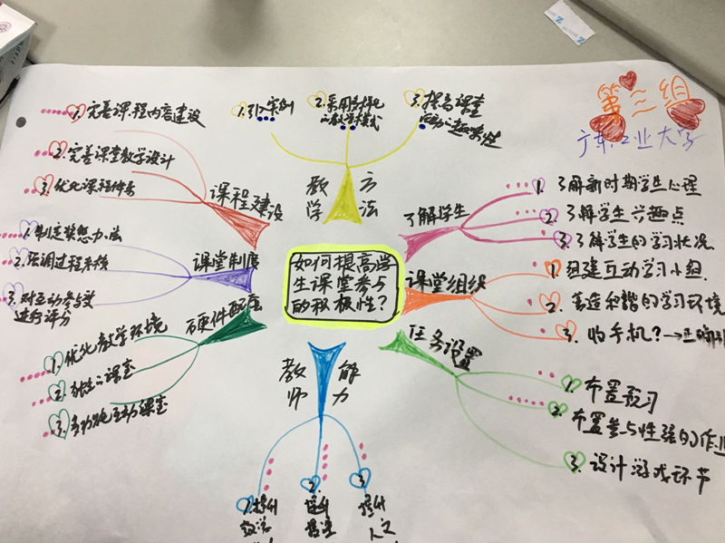 在团队学习环节,研修班以小组为单位,组织成员进行专题研讨和分工合作,以此促进不同学科领域教师的交流与融合。从“小组自由讨论”到“结构化研讨”,再到“成果展示汇报”等环节,各小组学员都积极参与到团队讨论活动当中,围绕如何改进和提升教育教学水平等话题进行深入的研讨,并相互分享了学习心得和汇报了学习成果。