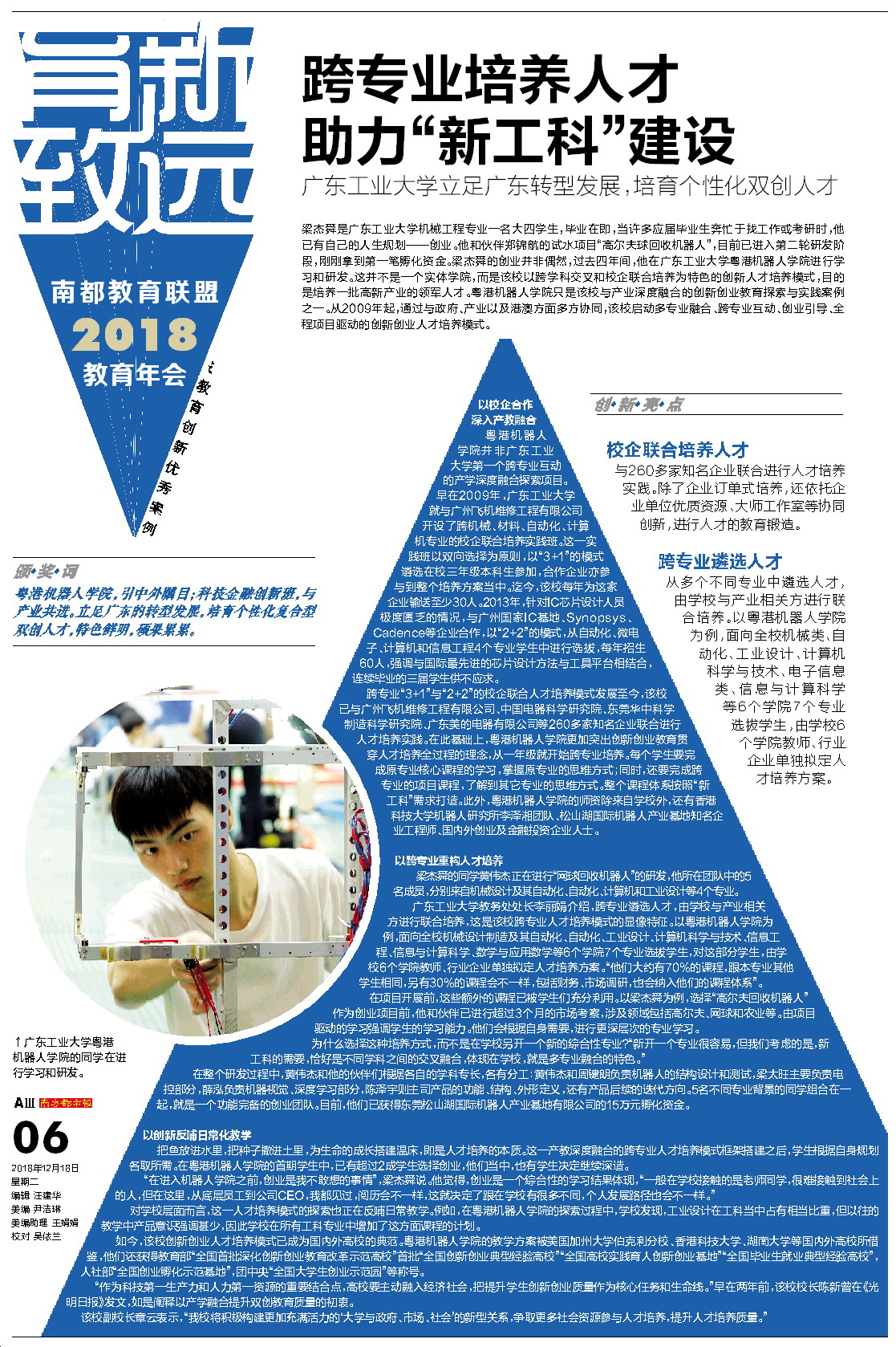 2018年12月18日出版的《南方都市报》整版报道了我校的这一做法。报道以粤港机器人学院、IC班的学生成长故事为实例,生动讲述了我校与政府、产业以及港澳方面多方协同,启动多专业融合、跨专业互动、创业引导、全程项目驱动的创新创业人才培养模式,尤其肯定了我校“以校企合作深入产教融合、以跨专业重构人才培养、以创新反哺日常化教学”的做法。颁奖典礼上,颁奖词这样写道:“粤港机器人学院,引中外瞩目;科技金融创新班,与产业共进。立足广东的转型发展,培育个性化复合型双创人才,特色鲜明,硕果累累。”